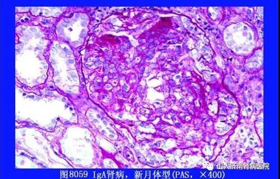 肾病理提示肾小球受累面积大于30%肾小球细胞弥漫增生硬化,大量新月体形成,广泛的简质纤维化和血管硬化,免疫荧光示毛细血管壁大量的igA沉积和C₃沉积,预后差。